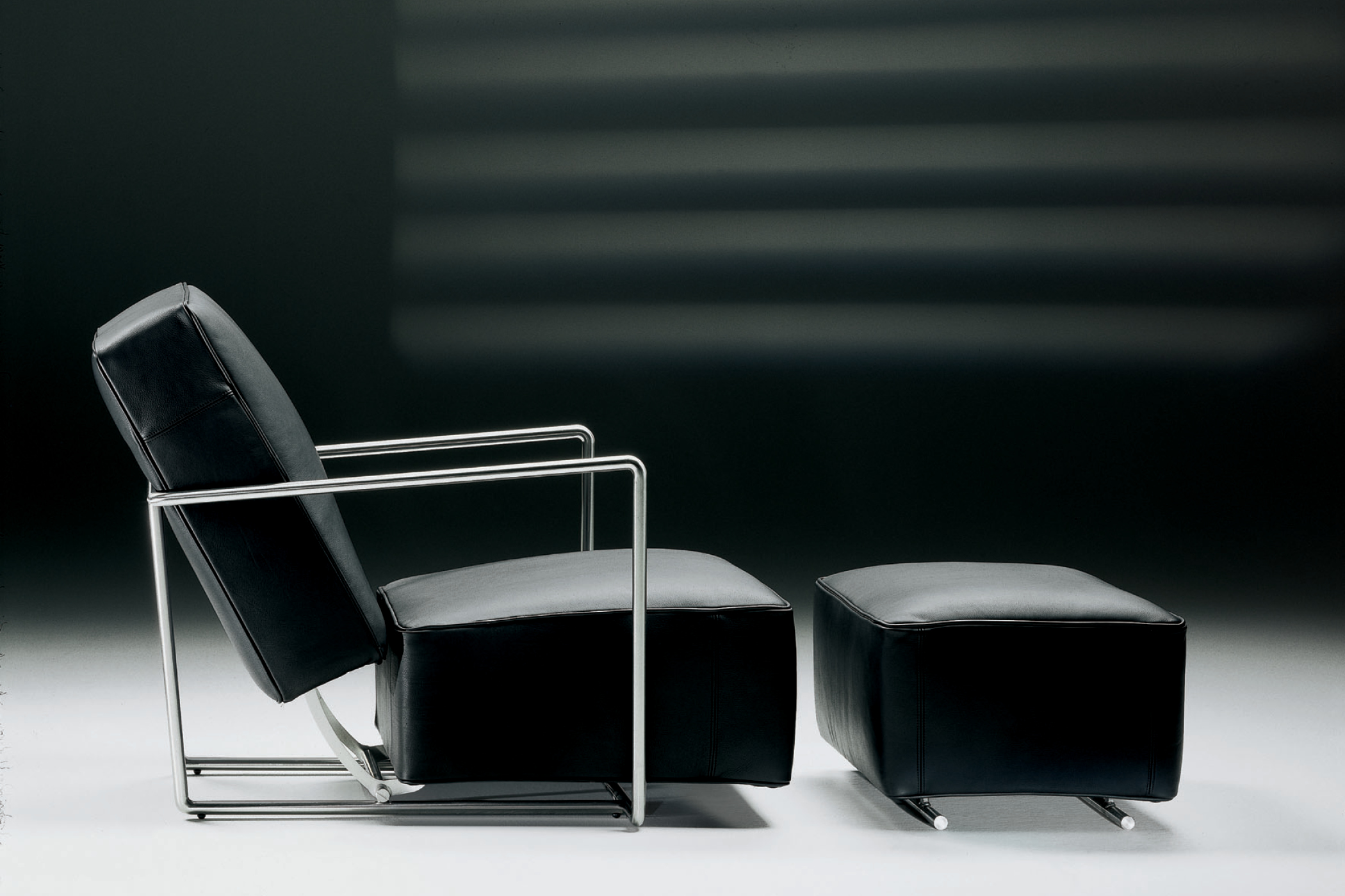A.B.C. reinterprets 1930s Rationalist design through a continuous tubular-steel frame and low seat. Upholstered in leather or fabric, it integrates a patented reclining mechanism that adjusts the backrest, combining clarity with measured comfort.