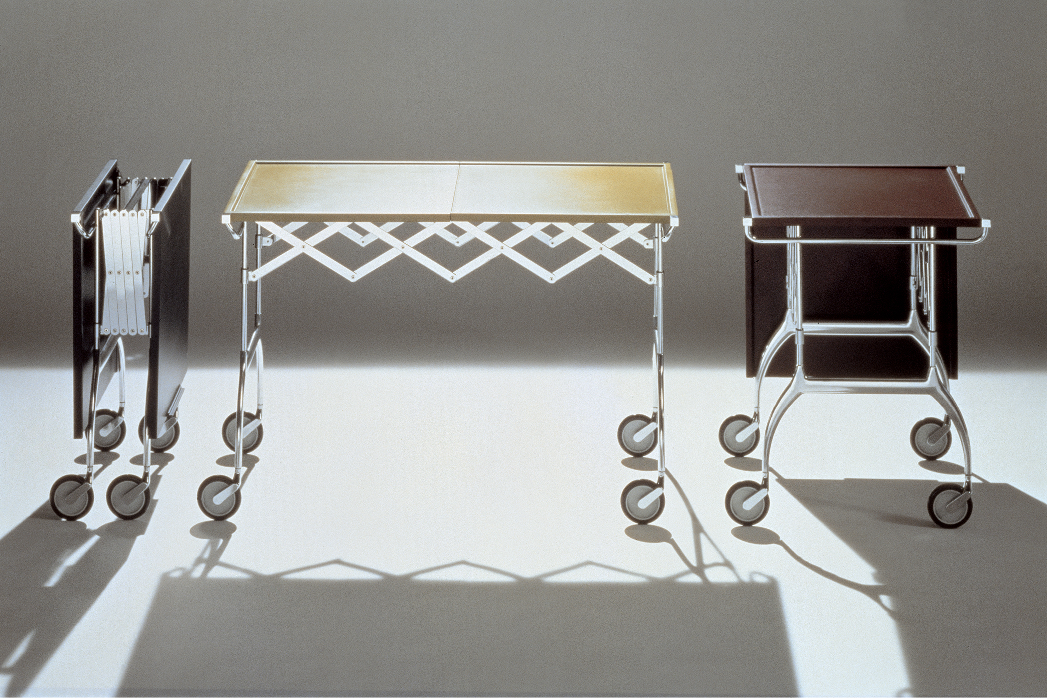 Conceived together for Kartell, Battista and Gastone reinterpret the domestic trolley through a shared folding mechanism. Painted polyurethane tops and die-cast aluminium feet define compact, adaptable pieces that introduced a new mobility in furniture.