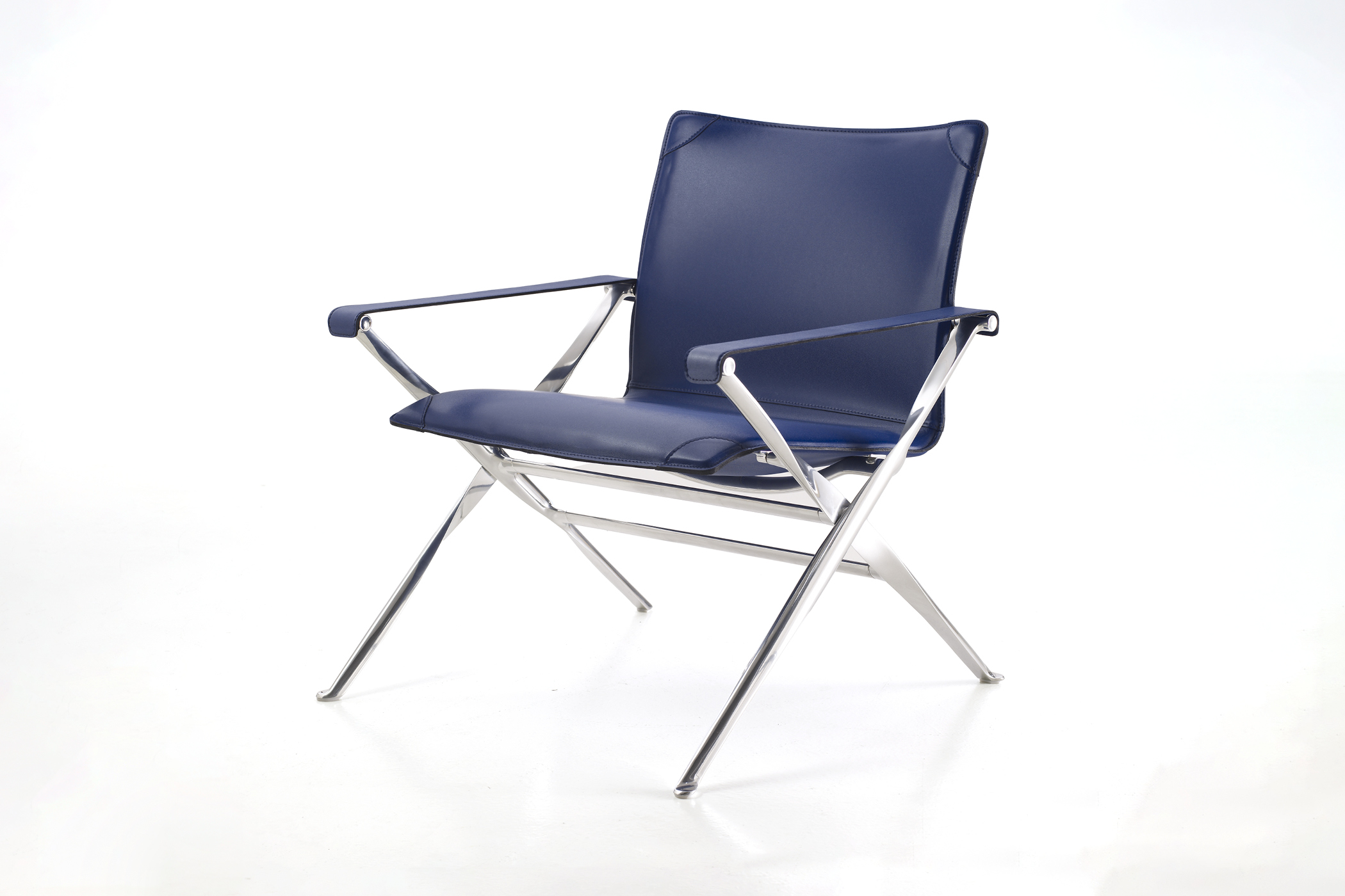 Folding armchair inspired by a 19th-century model. The die-cast aluminium frame, formed from a single oval section that folds back on itself, combines lightness and precision, supporting leather or fabric slings in various finishes and two backrest heights.