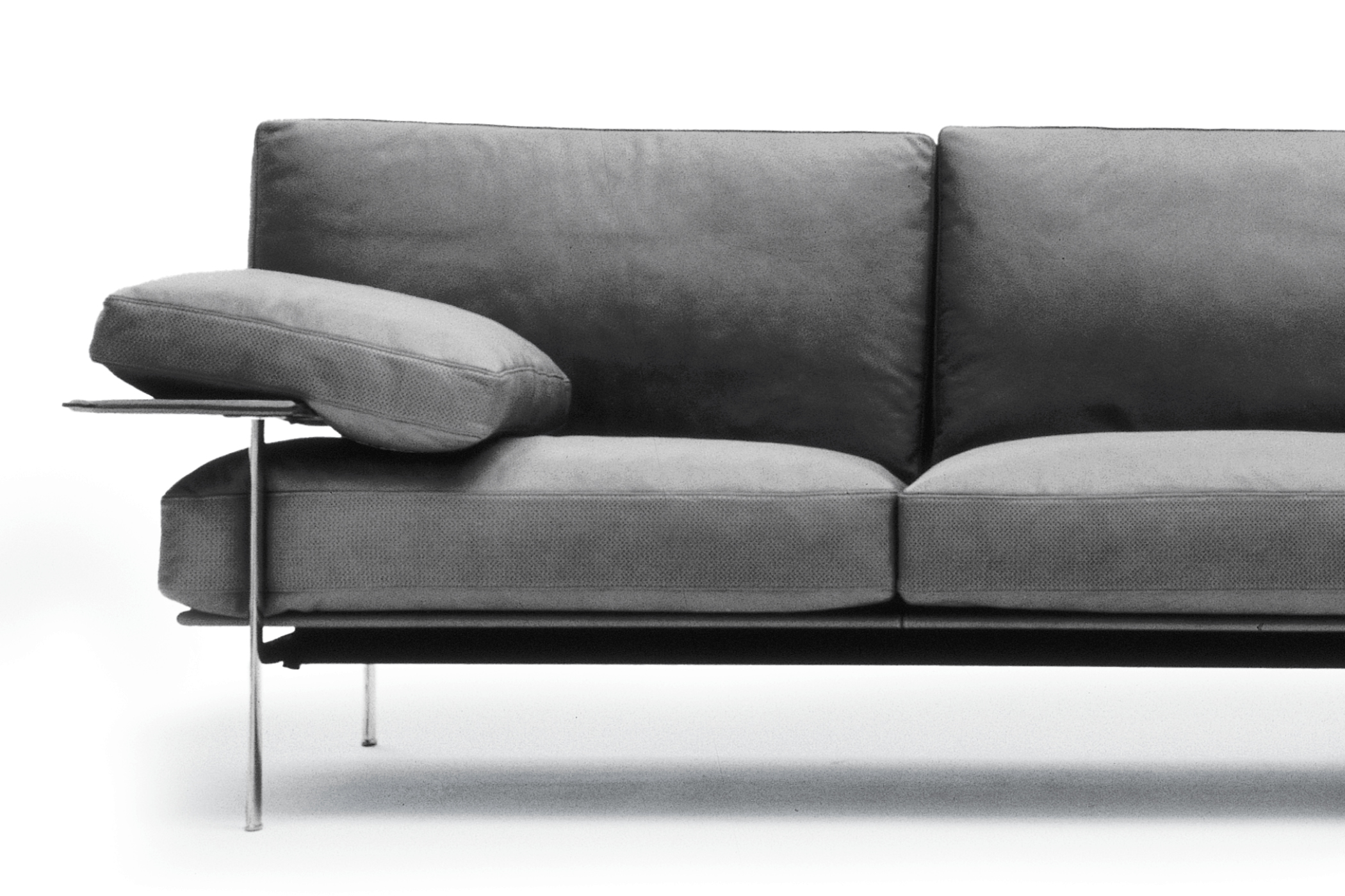 A die-cast aluminium exoskeleton supports thick leather-clad elements and down-filled cushions, making structure visible. Merging industrial logic and tactile comfort, it established a new typology for modern upholstered seating.