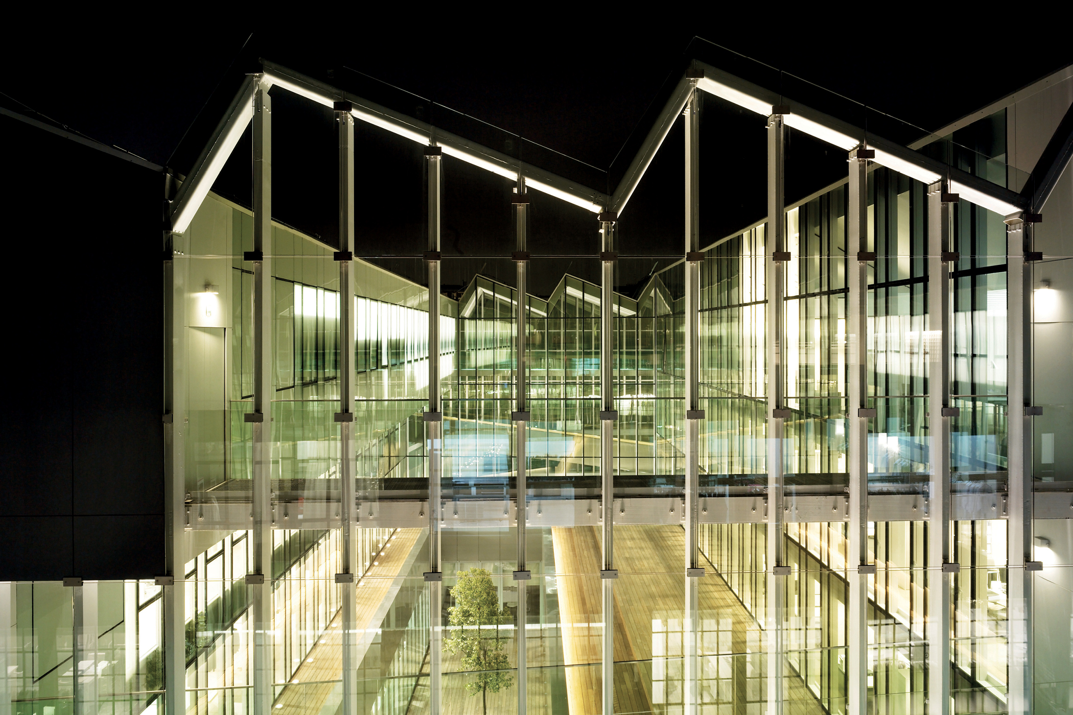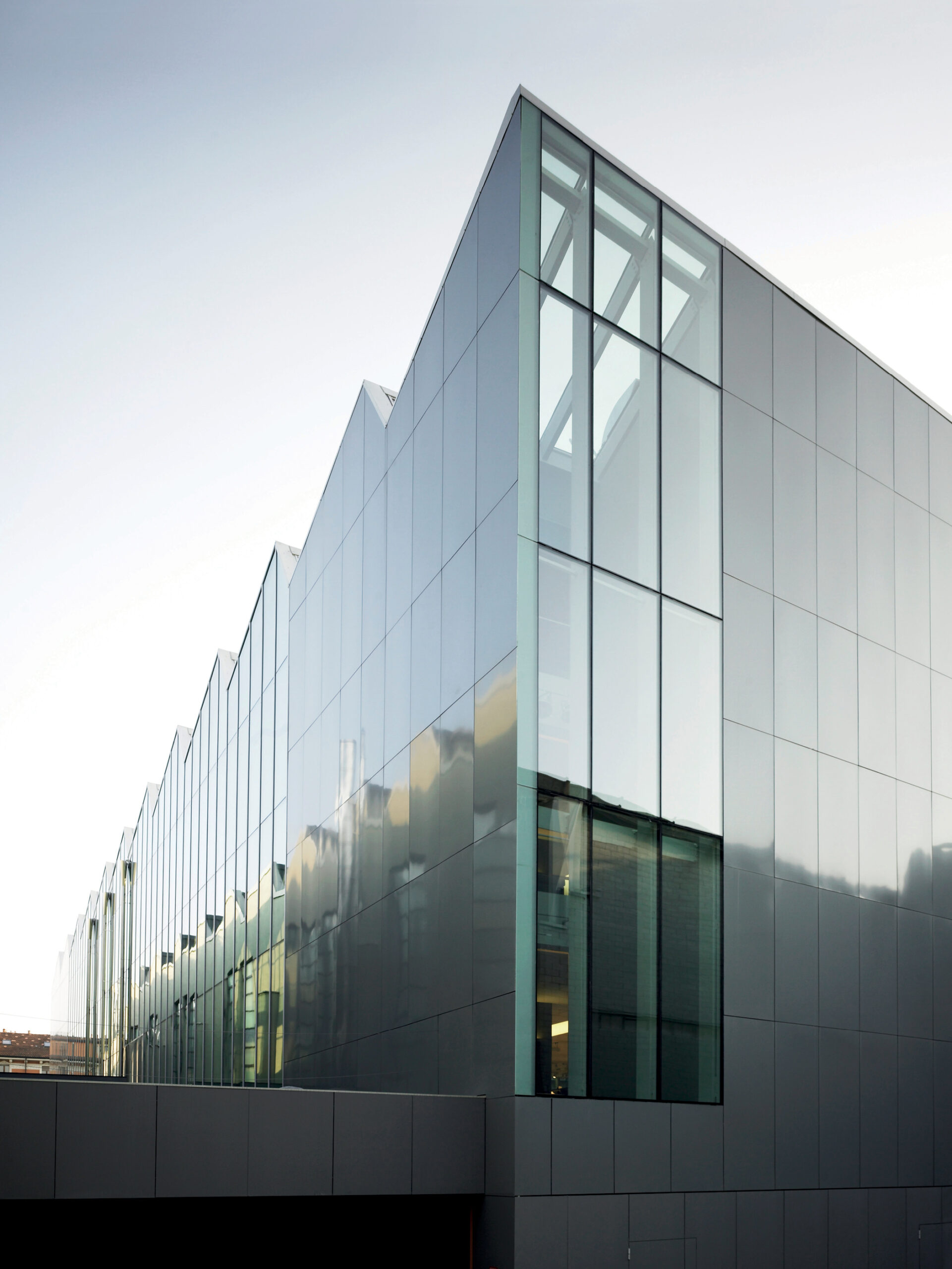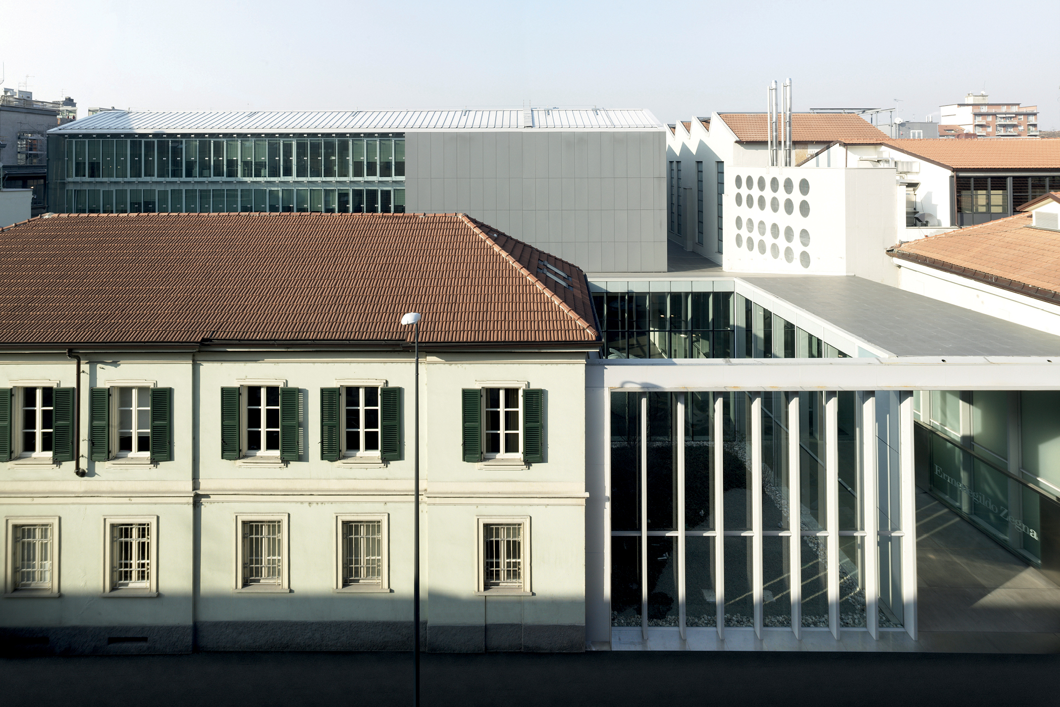 New-build Headquarters for Ermenegildo Zegna Group in the Tortona district of Milan, reinterpreting the saw-tooth industrial type as a compact, inward-facing workplace organized around a central courtyard-theatre and a glazed atrium on Via Savona.