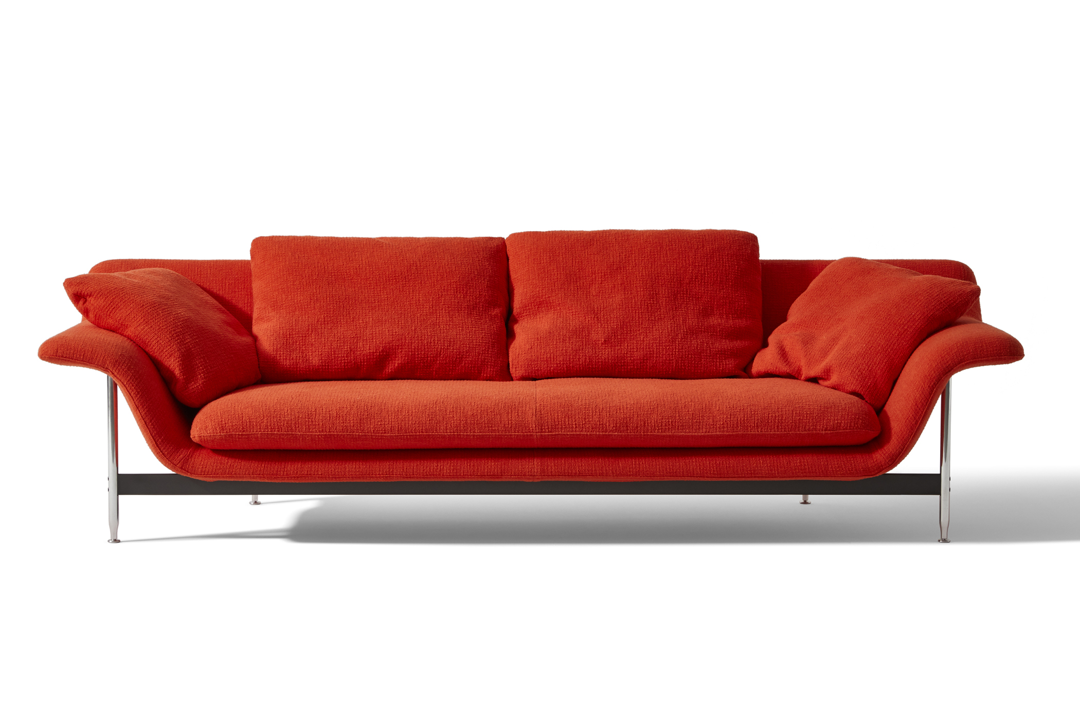 Sofa system built around a polished aluminium exoskeleton supporting a soft shell and cushions with recycled-content fillings. Eight modular elements allow linear or corner configurations, merging comfort with contemporary research into material circularity.