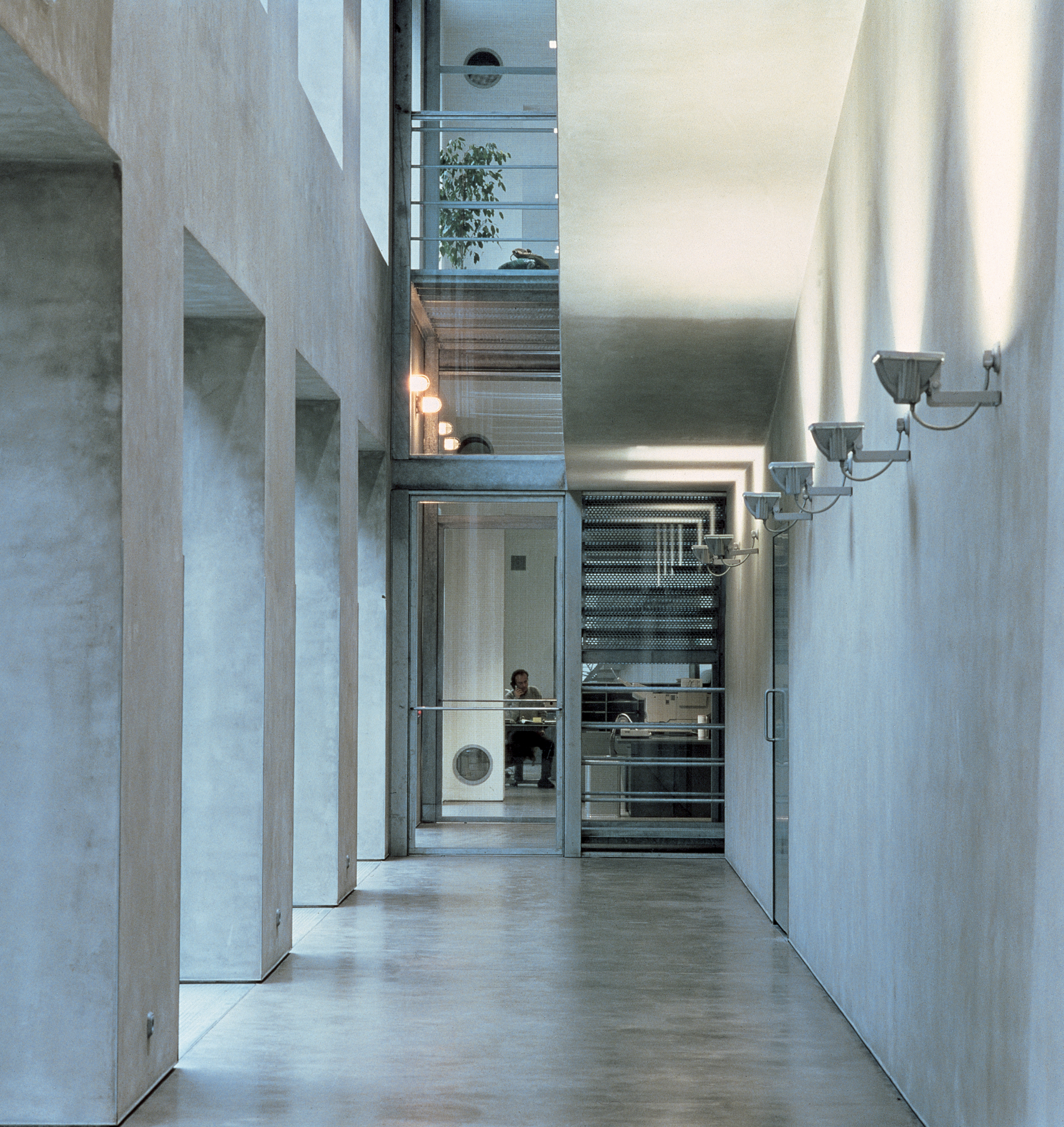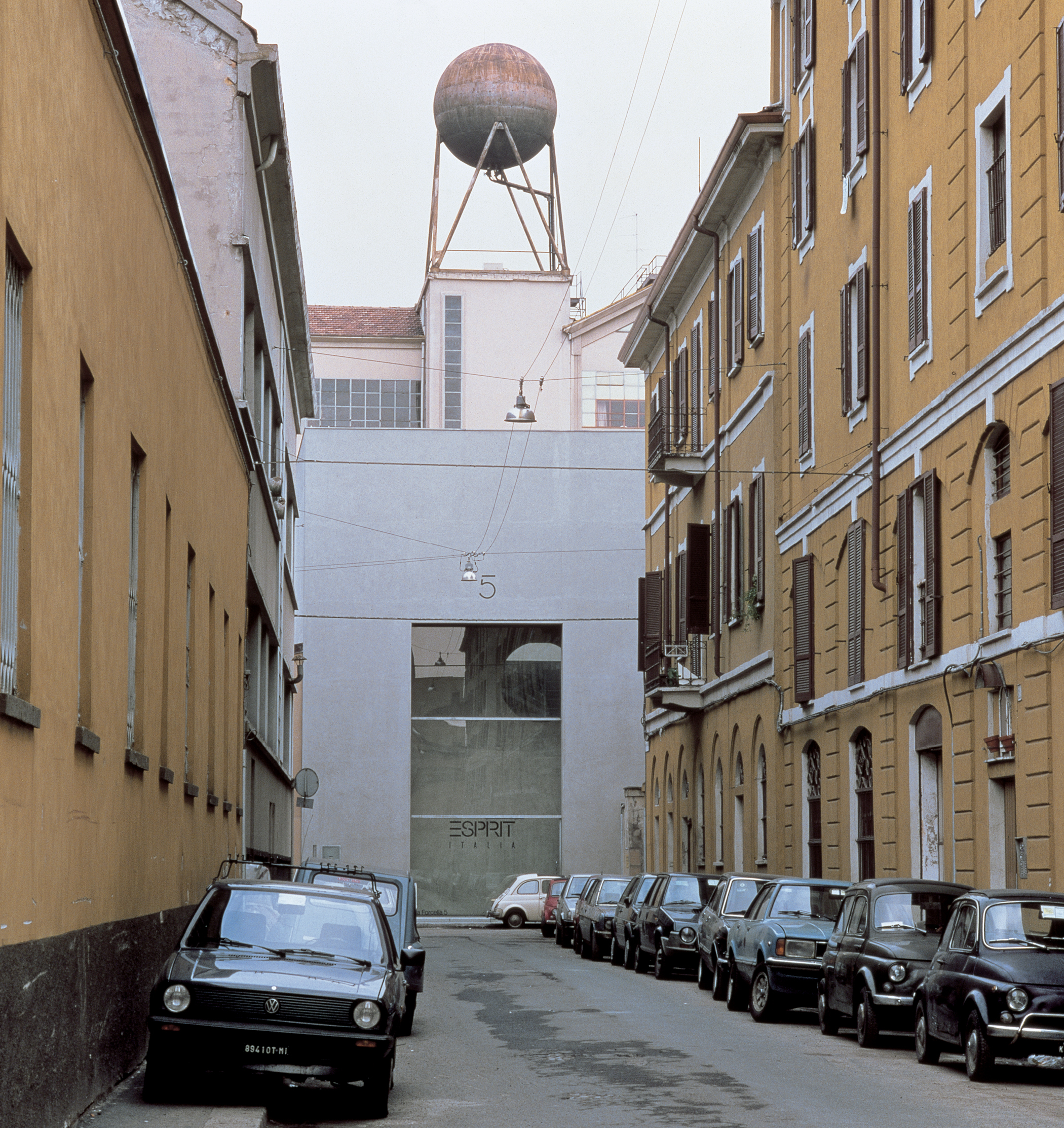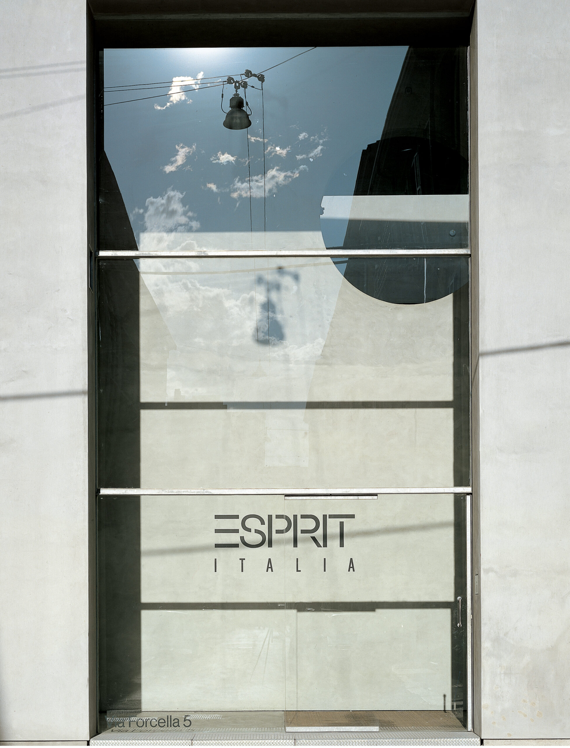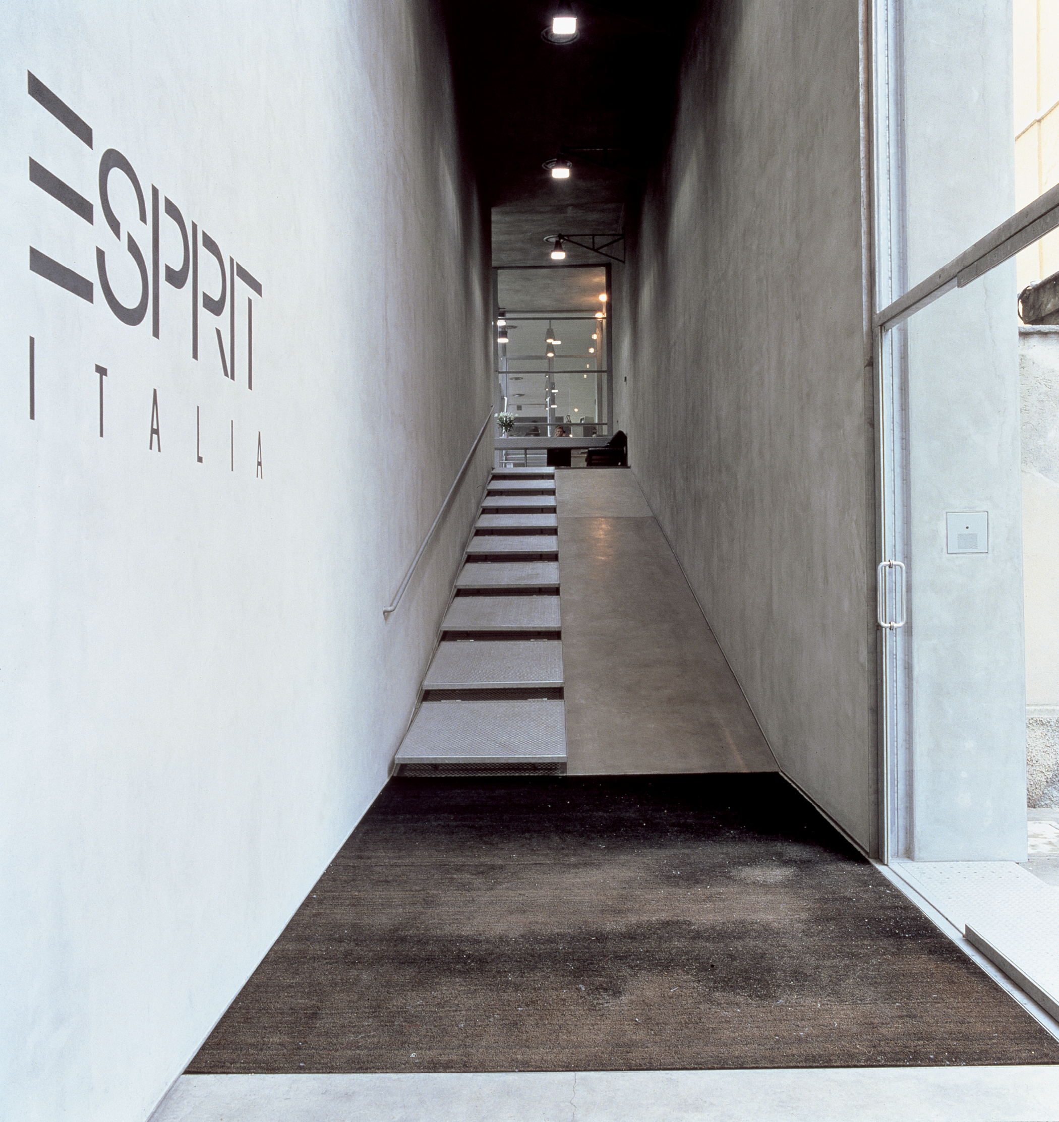 Adaptive reuse of a former industrial complex in Milan into Esprit’s Italian HQ and showroom: courtyards become open-air rooms linked by ramps and bridges, as plastered facades, galvanized-steel ramps and concrete floors tie the ensemble together.