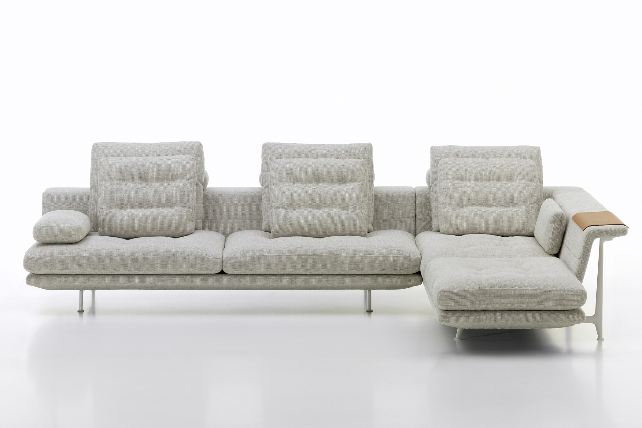 Sofa system combining large modular elements with a die-cast aluminium base. It approaches domestic seating as an open, configurable platform, integrating options for relaxation and work within a single, adaptable structure.