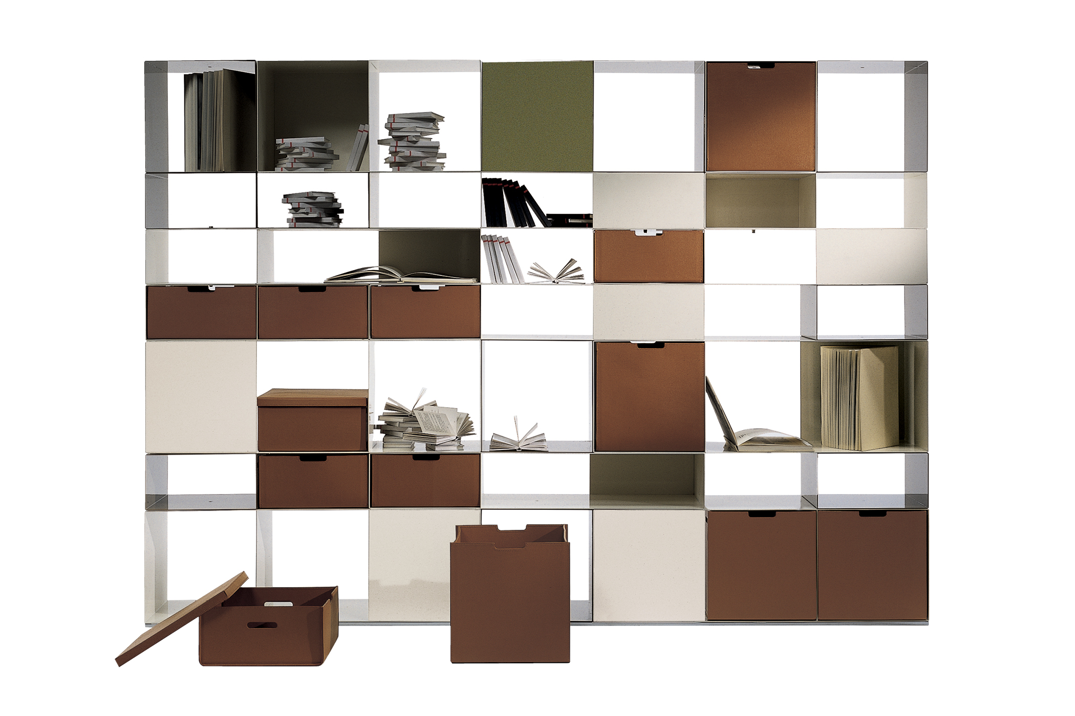 A modular bookcase system composed of enamelled metal units joined by invisible connectors. The design eliminates the container to emphasise its contents, creating open compositions of solids and voids that balance precision with material warmth.