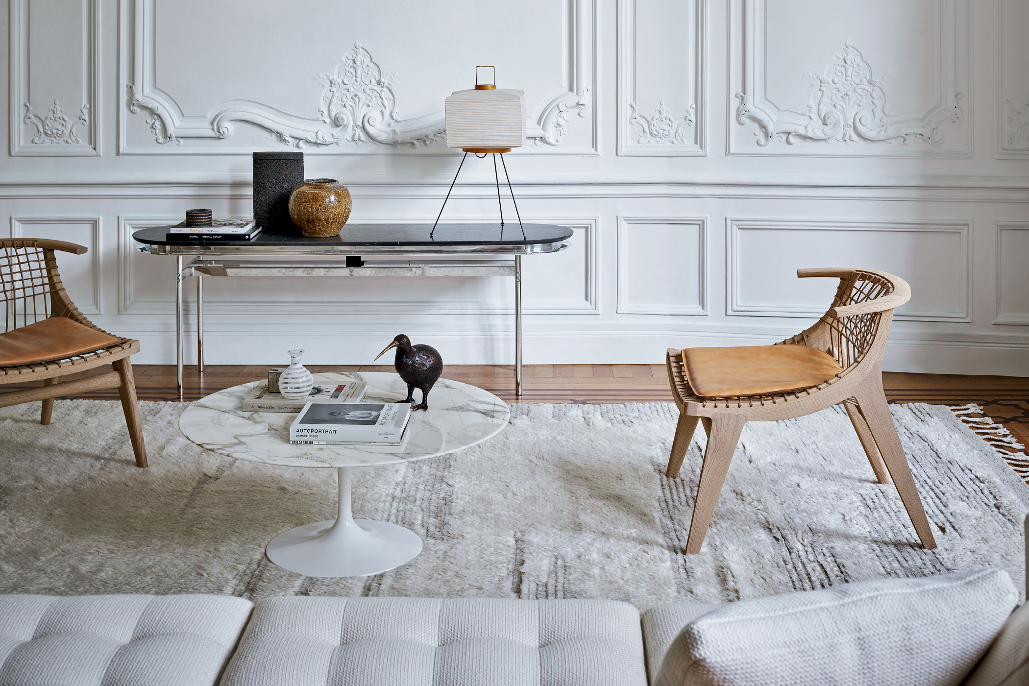 Collection built around oak structures with seats and backs in woven cotton cord, offered also with wooden backrests. Chairs, sofas, benches, a chaise longue and tables explore a contemporary reading of classical references, using natural materials and calibrated proportions across the range.