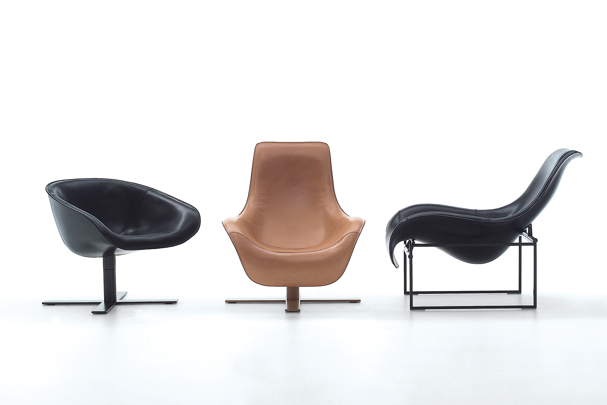 Developed through research into thermoformed thick leather, the chair explores how structural form can generate comfort. The heat-shaped shell and metal bases reflect a technical approach to craft, balancing precision, proportion, and material continuity.