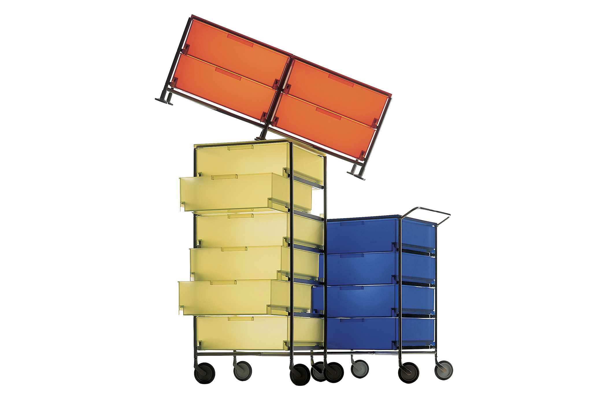 Storage system for Kartell that introduced the first use of frosted, semi-transparent PMMA, a material innovation inspired by etched glass. Established a new aesthetic for transparency later echoed beyond furniture design. Awarded the Compasso d’Oro (1994).