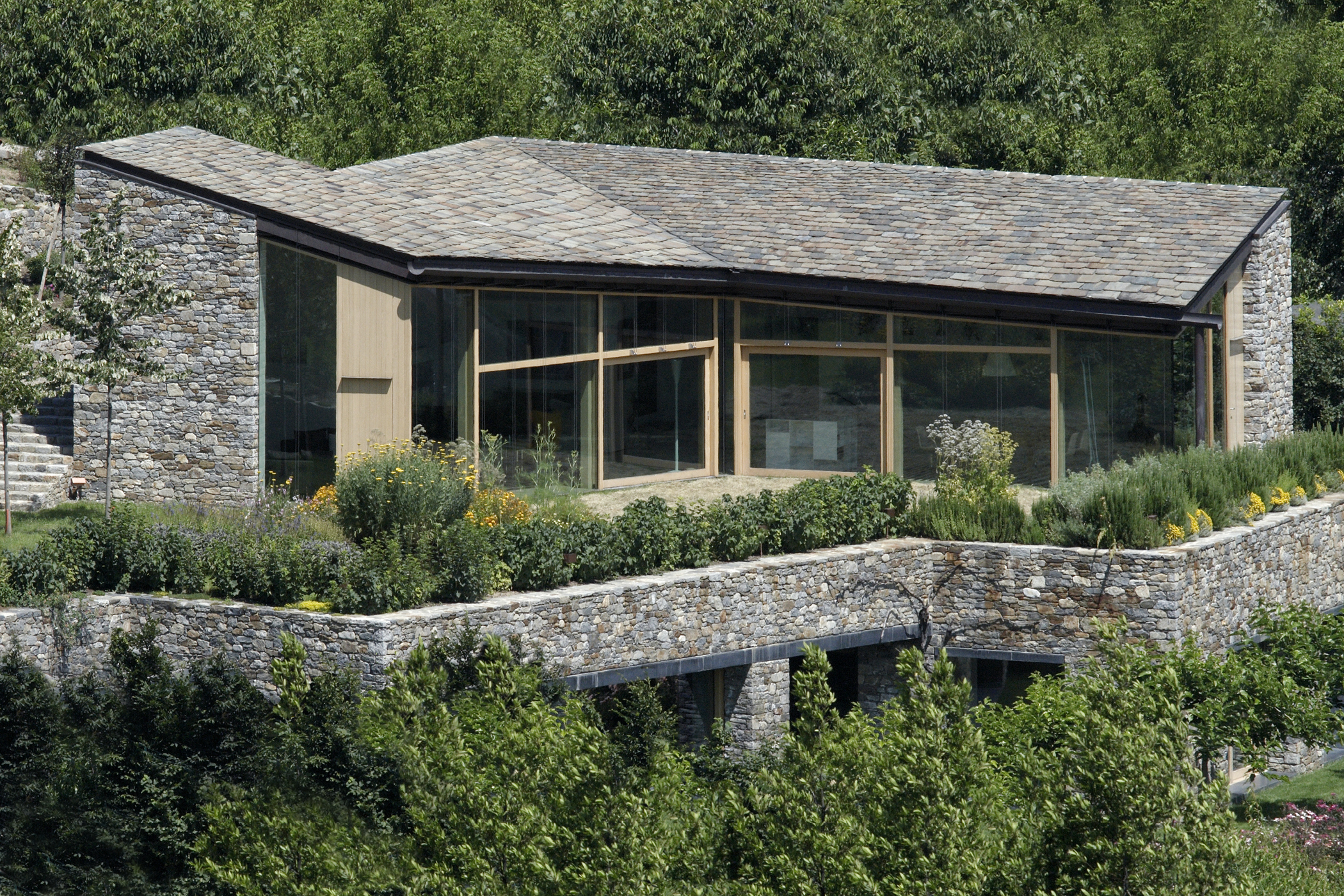 Set on a vineyard hillside above Sondrio (Valtellina) in northern Italy, the house emerges from a stone base sunk into the slope, while a transparent top floor -living and kitchen-opens south to garden and pool.