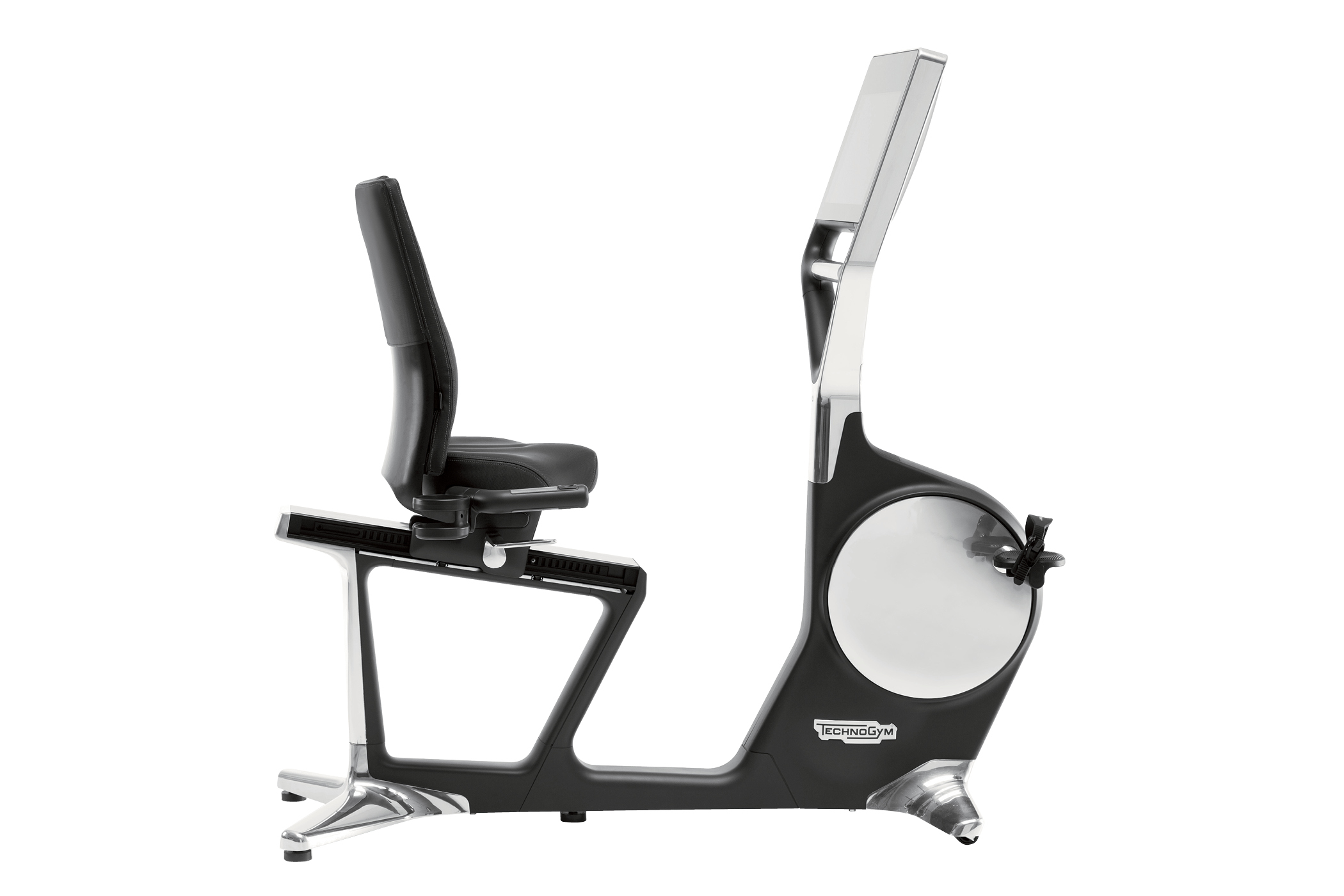 Recumbent exercise bike developed with Technogym as part of the Personal line. The die-cast aluminium frame and Vitra-designed ergonomic seat translate professional biomechanics and material precision into a form conceived for domestic interiors.