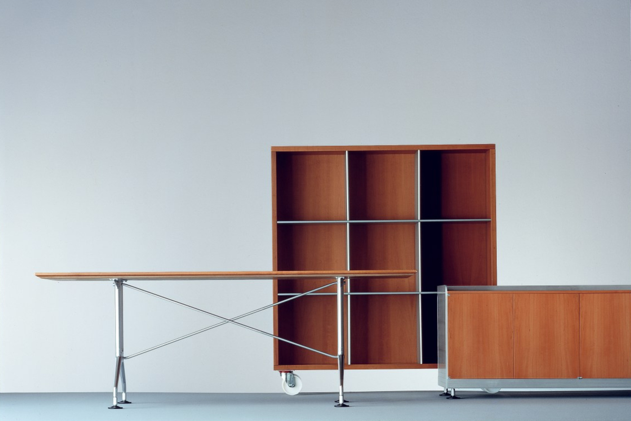 An early office collection exploring modularity and flexibility. Composed of tables, drawers, storage units, and bookshelves, it introduced freely combinable elements built from aluminium frames and wooden surfaces, bridging rationalist clarity and adaptable workspace design.