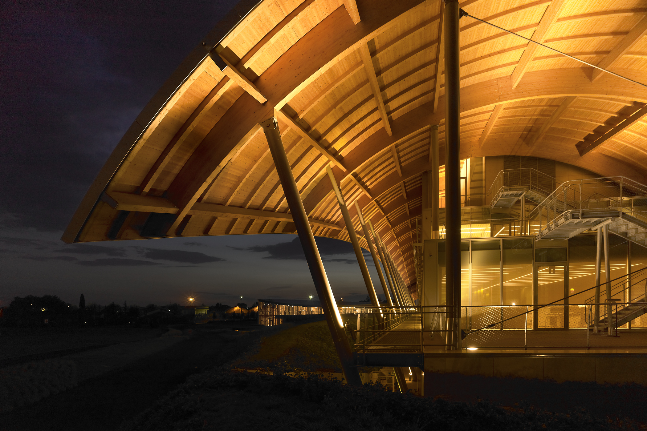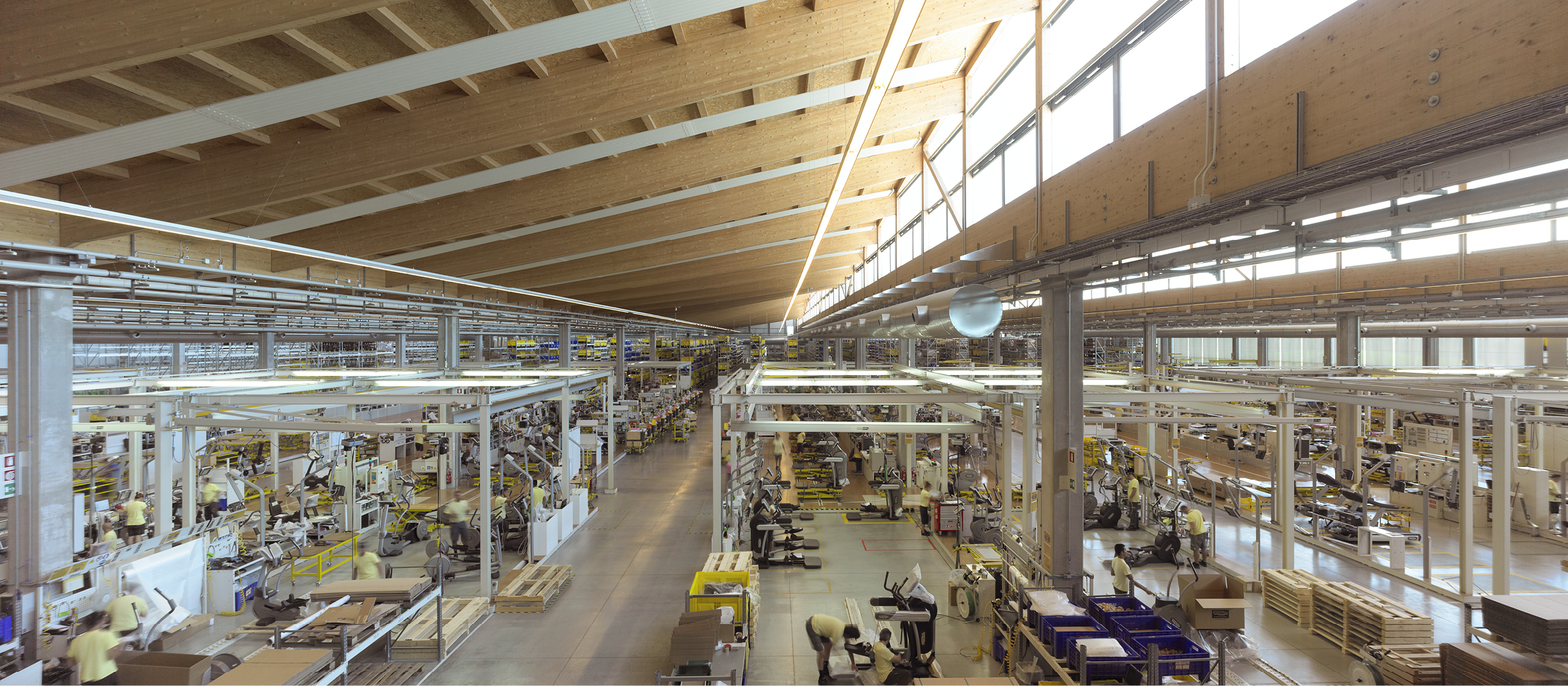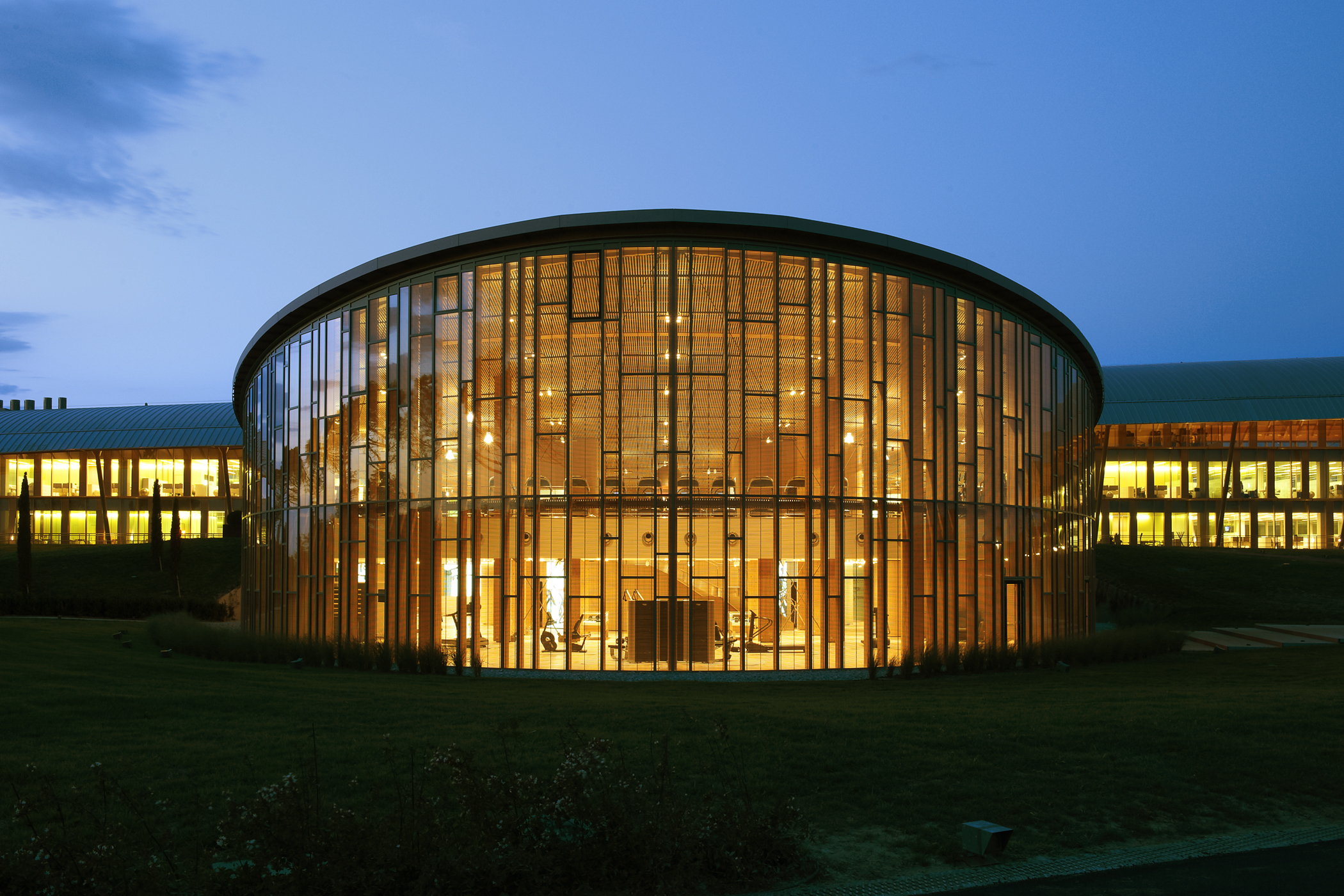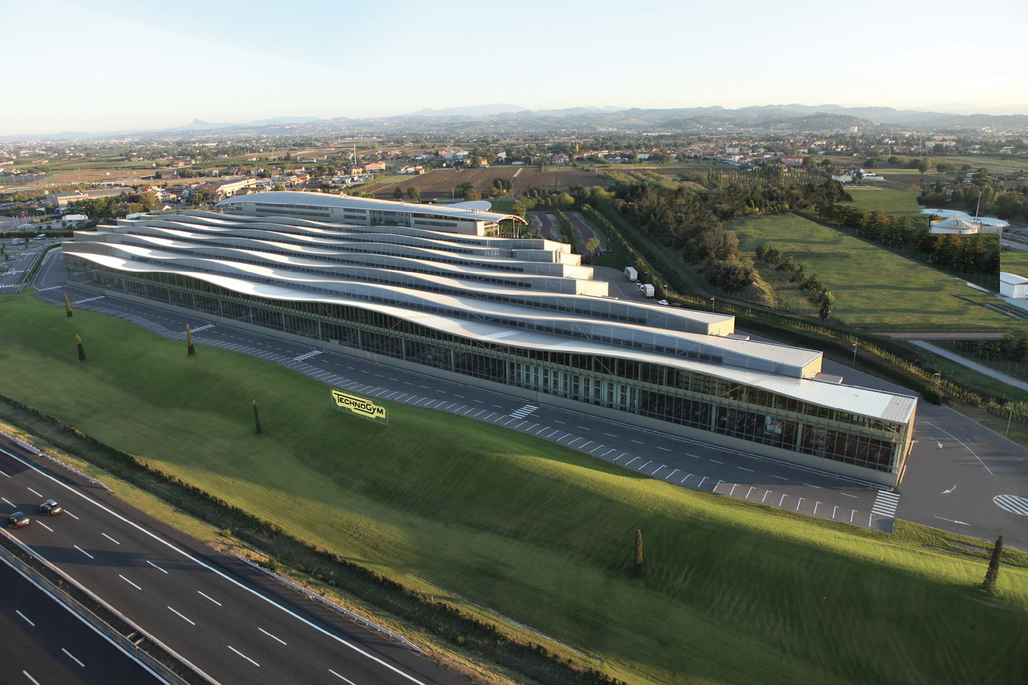 Corporate campus in Cesena for Technogym: a 15-hectare Village with a 300-m production hall, a four-storey office/R&D block, and an elliptical timber-and-glass Wellness Center set in a landscape park along the A14 motorway.